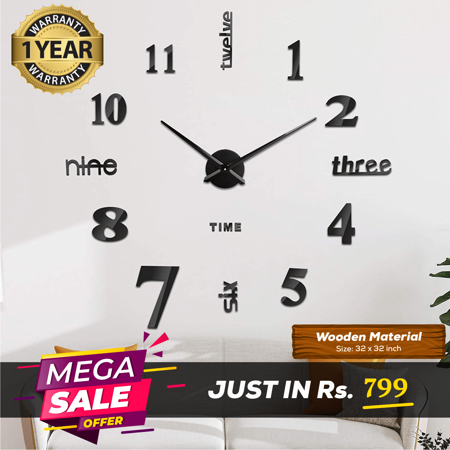 LARGE SIZE WOODEN DIY CLOCK WITH 12 INCHES NEEDLES